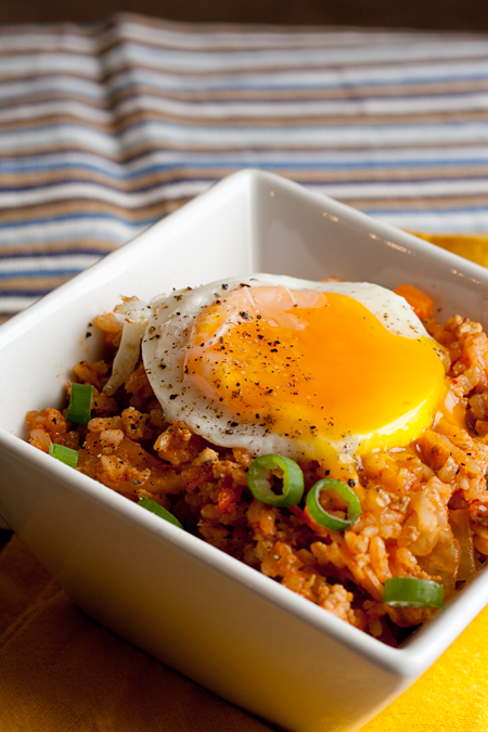 Meanwhile, saute day old rice in sesame oil and gochuchang (Korean hot pepper paste) and stir in a healthy amount of kimchi. Keep warm. In another skillet, saute the tofu, along with the marinade, until piping hot and fold into the rice. Then - the best part - top each serving with a runny fried egg.