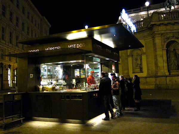 Okay, I admit that by now Poppa Trix and I were well and truly full. But - it was our last night! And so we had one more stop to make: The wurstel stand near our Ringstrasse hotel (a generous gift from Mother-in-Law-Trix):